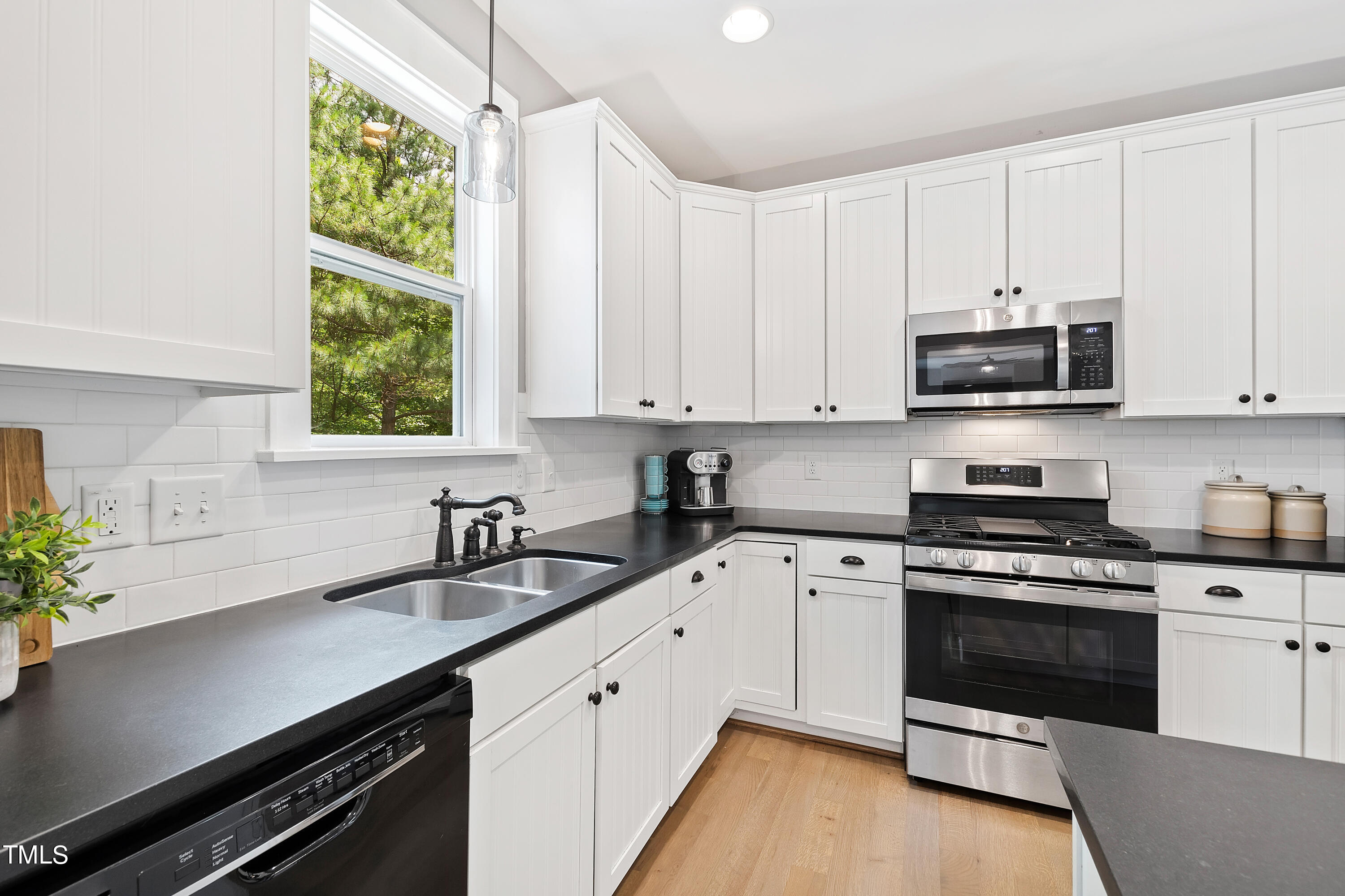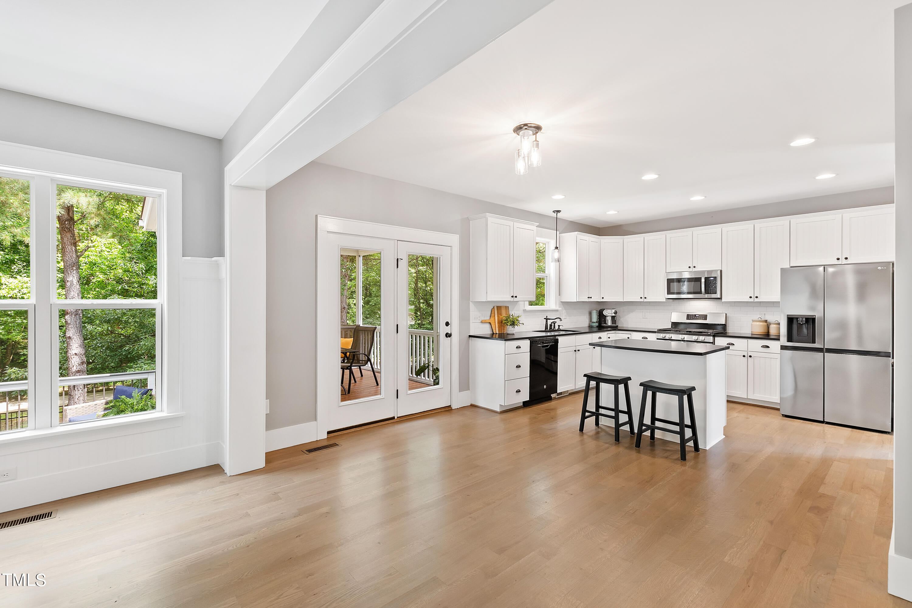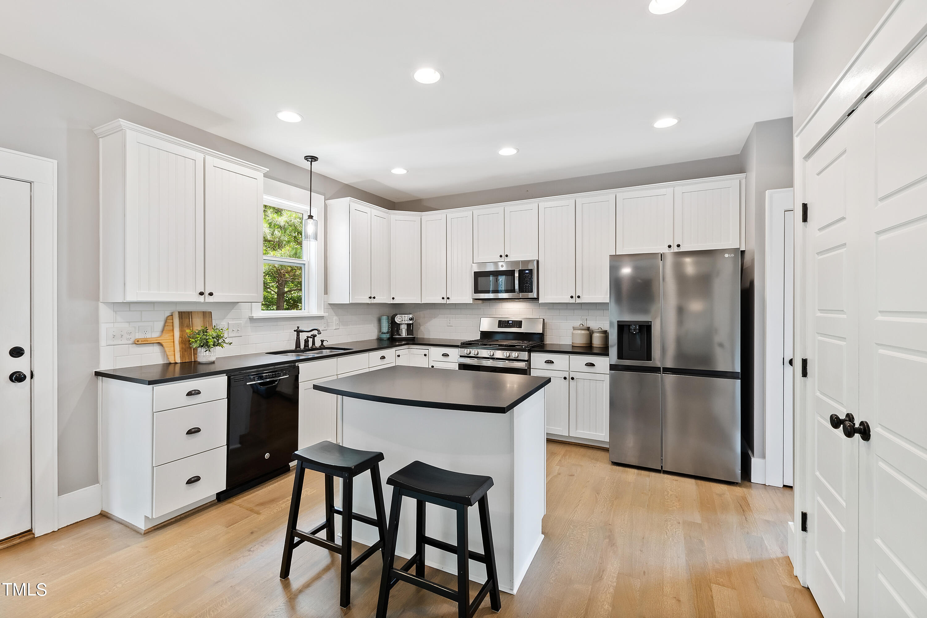 The main level boasts site-finished hardwood floors (newly installed in 2022) that exude warmth and elegance, providing a seamless flow between the kitchen, living, dining and first floor office areas. The spacious, open-concept kitchen features a gas range, a new dishwasher, ample counter and storage space, making it a chef's delight.