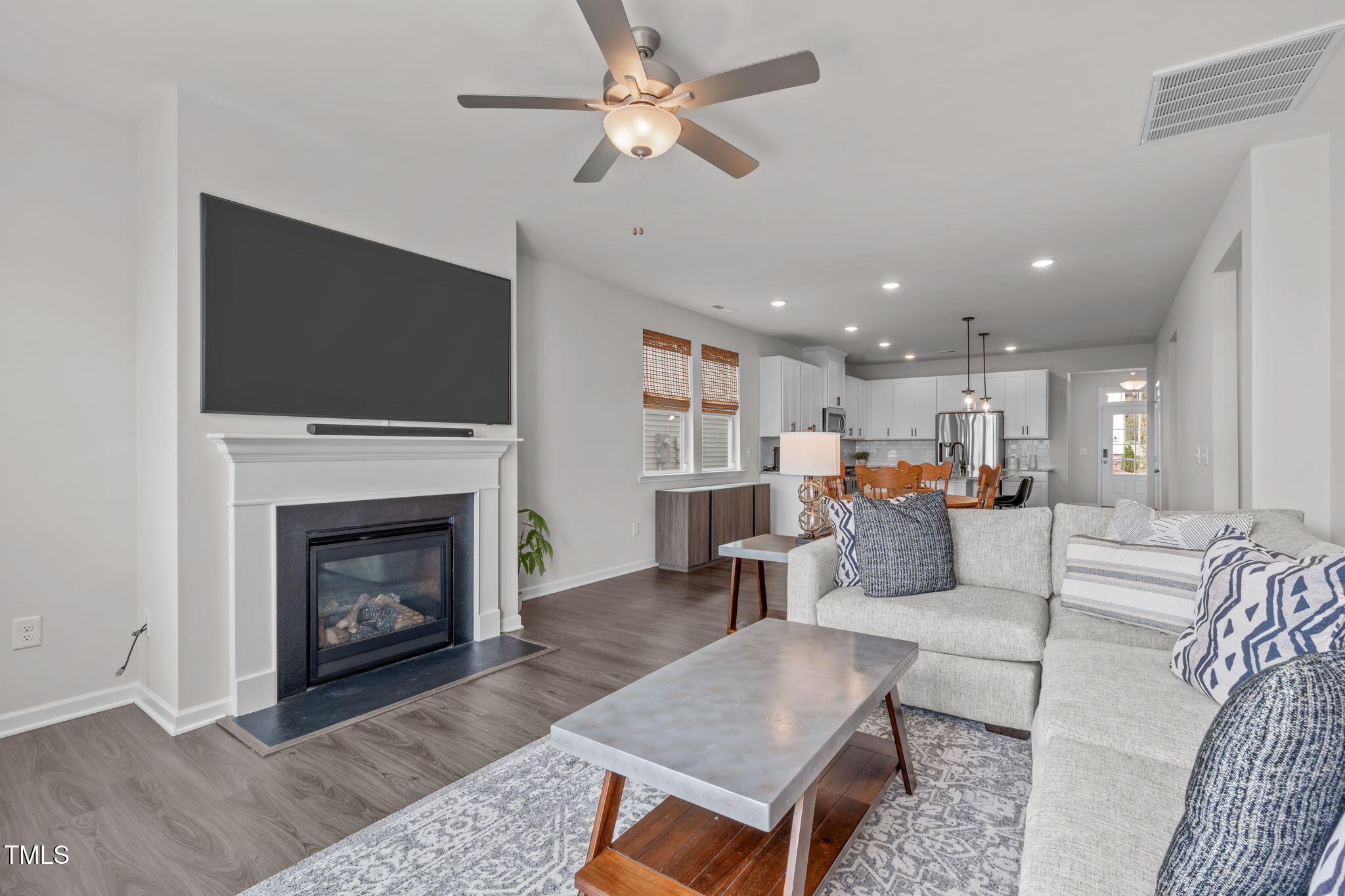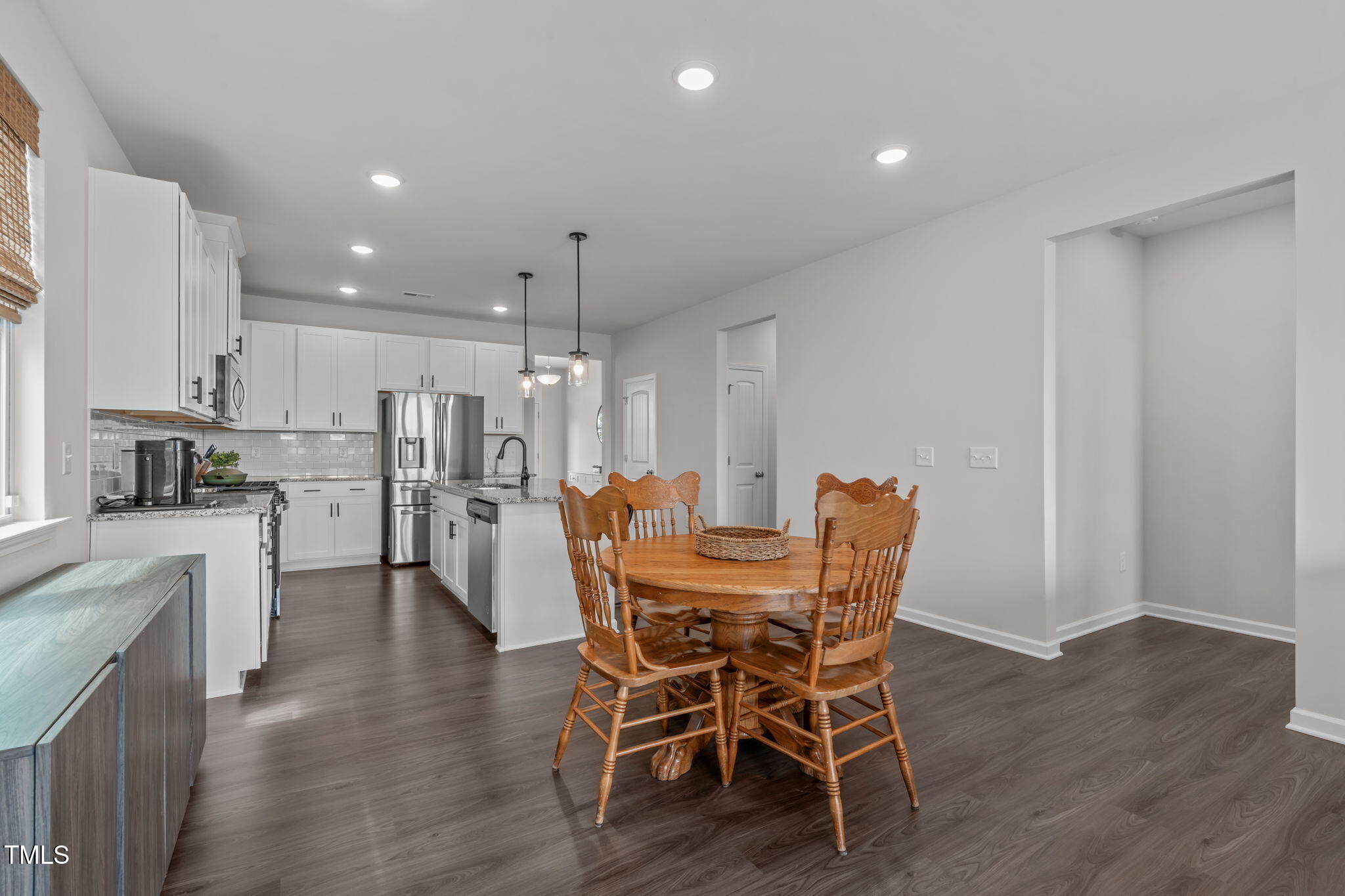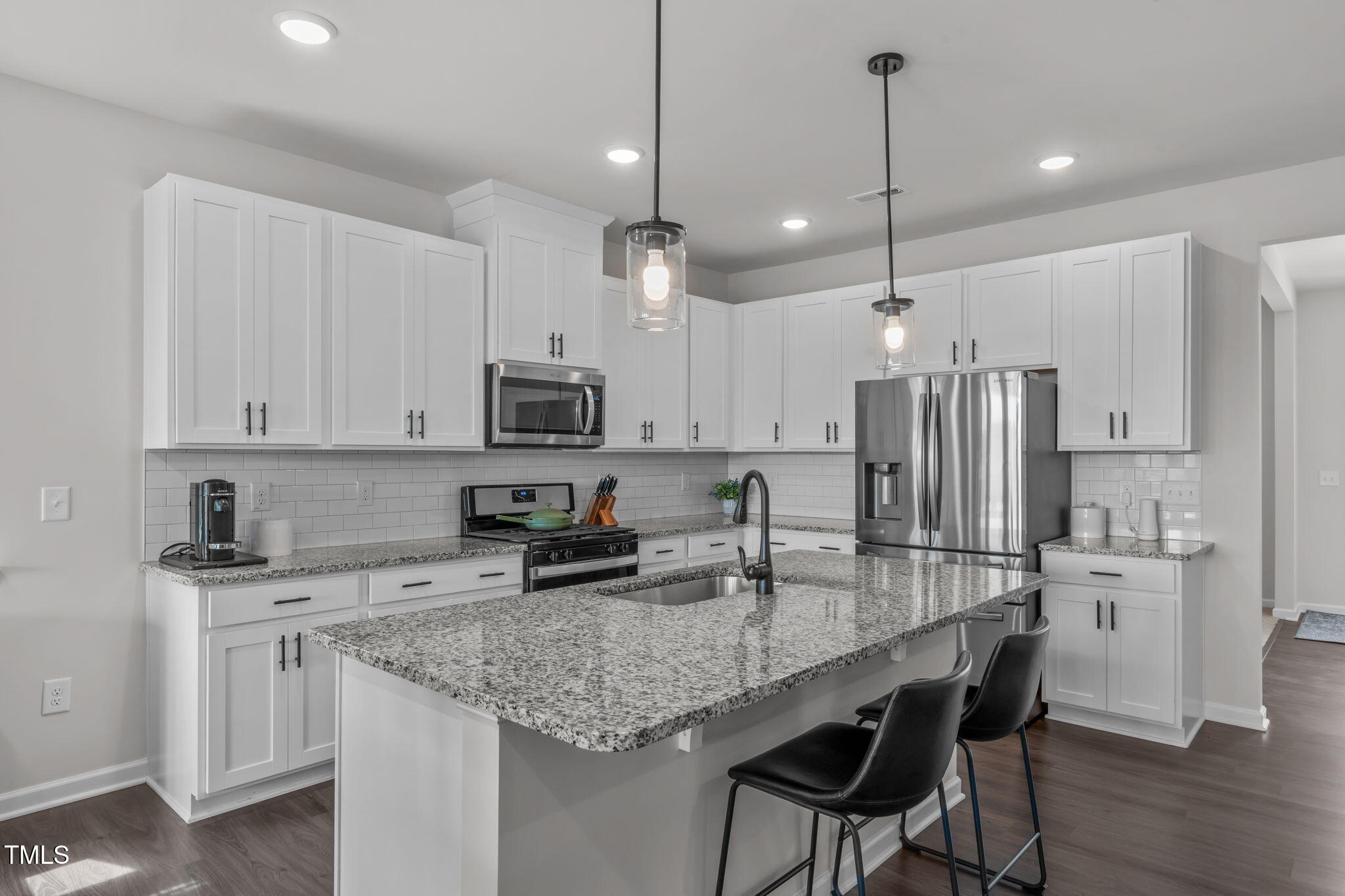 Step into the foyer where a versatile flex room awaits, ideal as a home office, study, or sitting area. Two generously sized secondary bedrooms are positioned to create a private section of the home for guests, with one featuring its own walk-in closet. The open concept main living spaces provide easy flow, with a kitchen highlighted by granite countertops, a tile backsplash, a gas range, stainless steel appliances, a large island with counter height seating, and bright, beautiful white cabinetry. Seamlessly connected to the dining area and living room, the design works equally well for everyday living and entertaining.