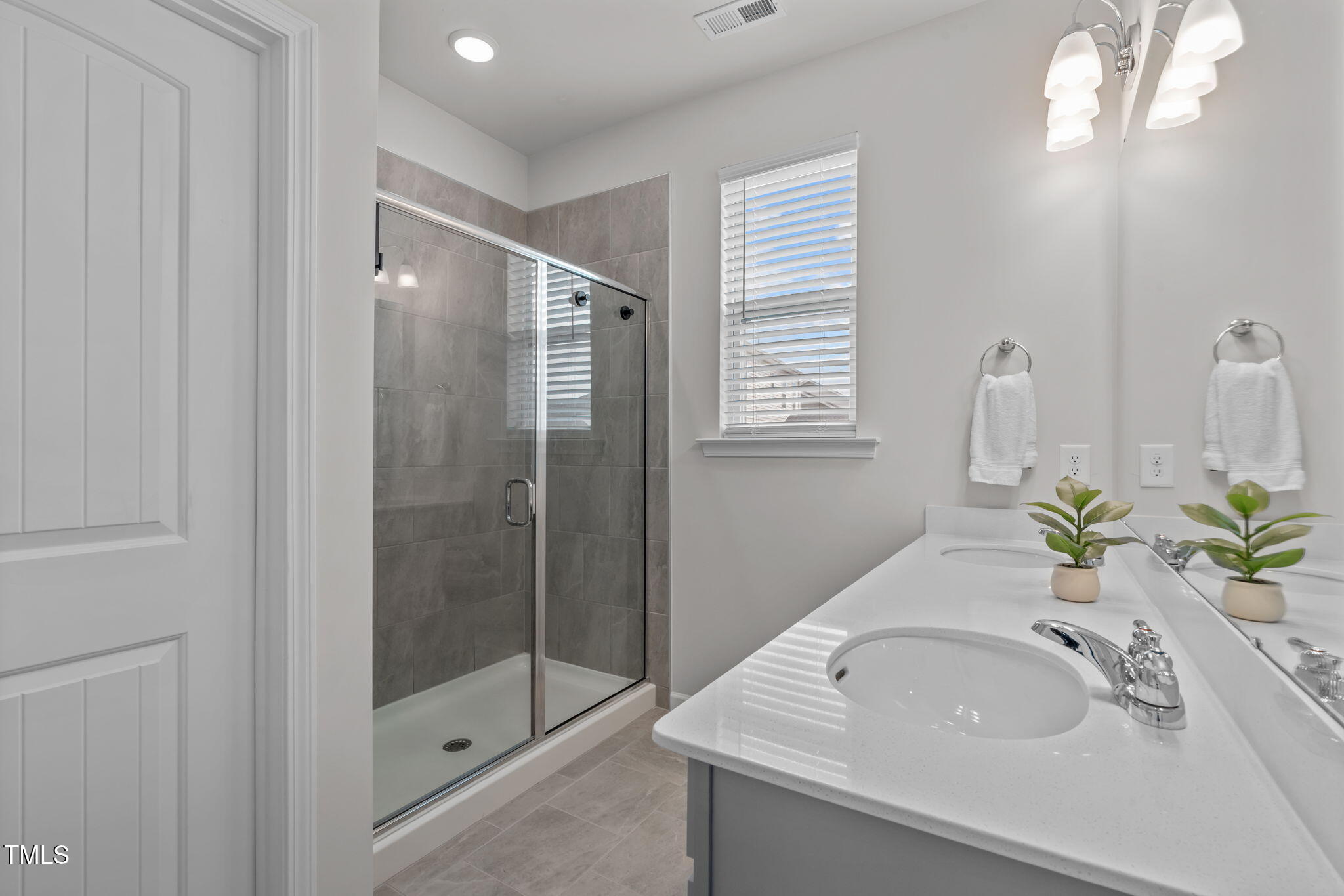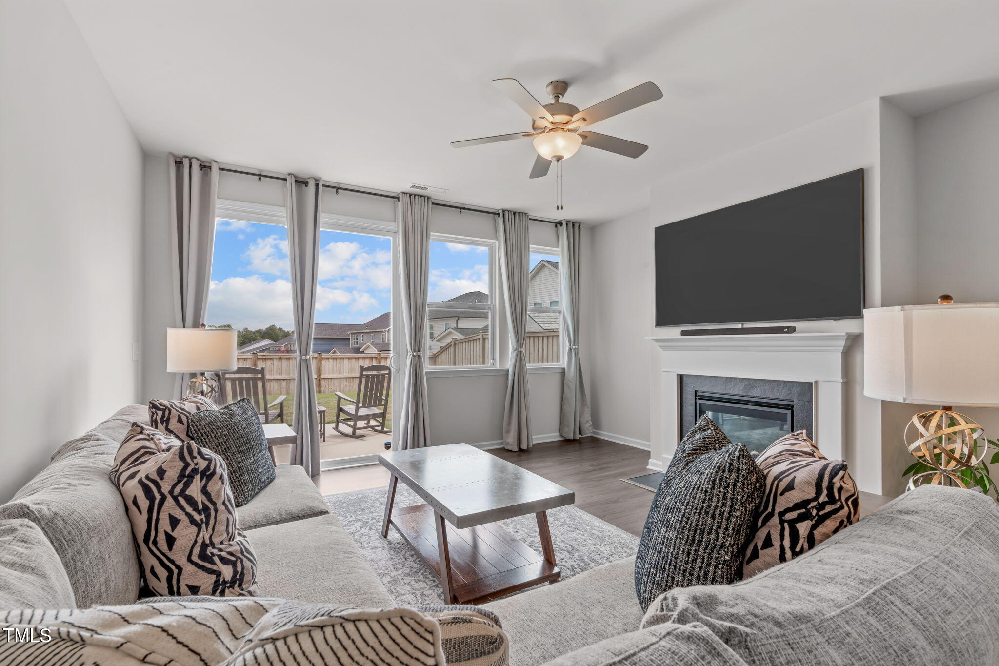 The owner's suite includes dual walk-in closets and a generous en suite bath with quartz topped double vanity, tile flooring, a beautifully finished shower wall, and a private water closet. Additional features include LVP flooring in the common areas, a natural gas log fireplace, a covered front porch, a laundry room with convenient drop zone off the garage entry, and a 2 car garage.