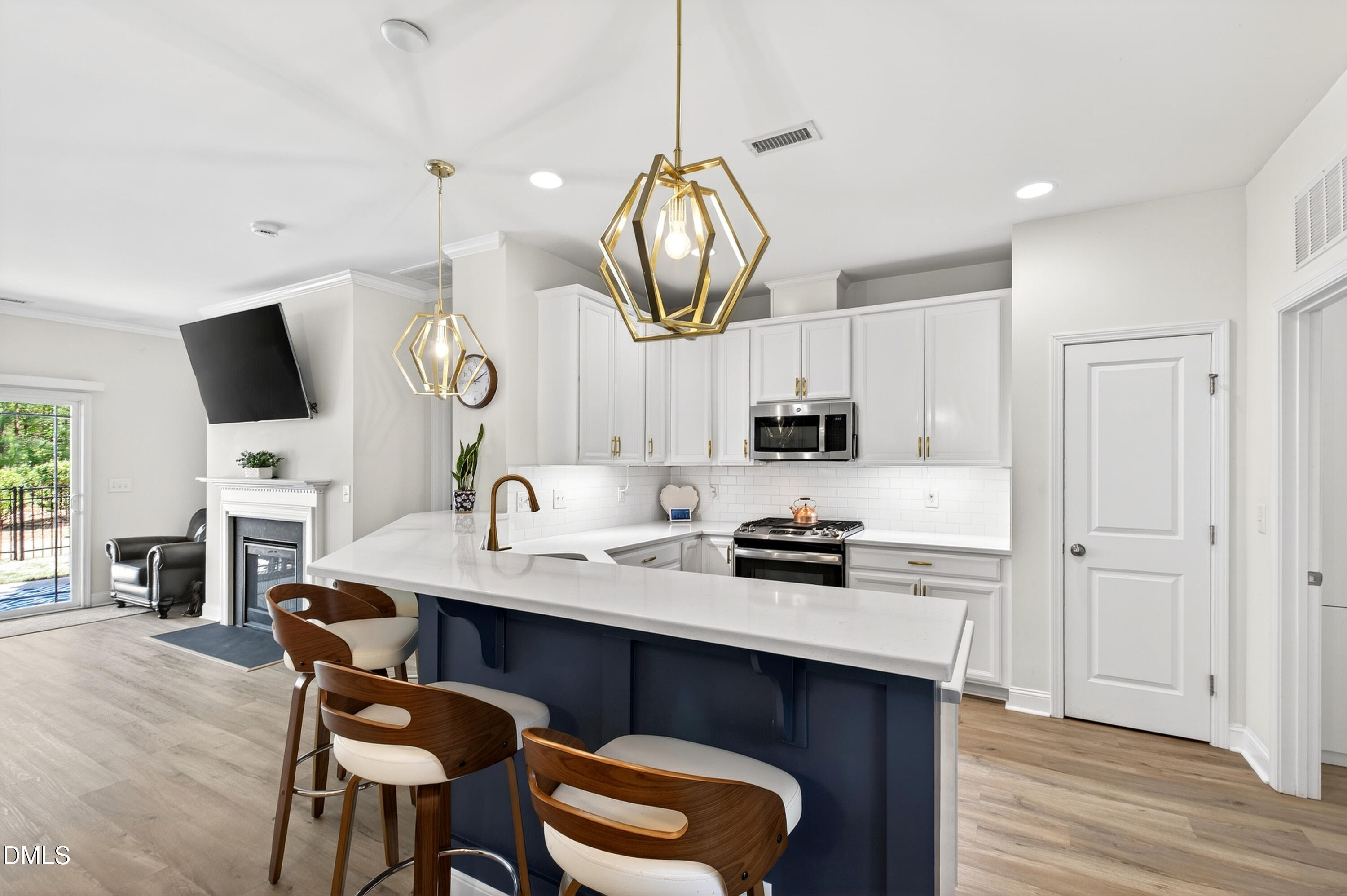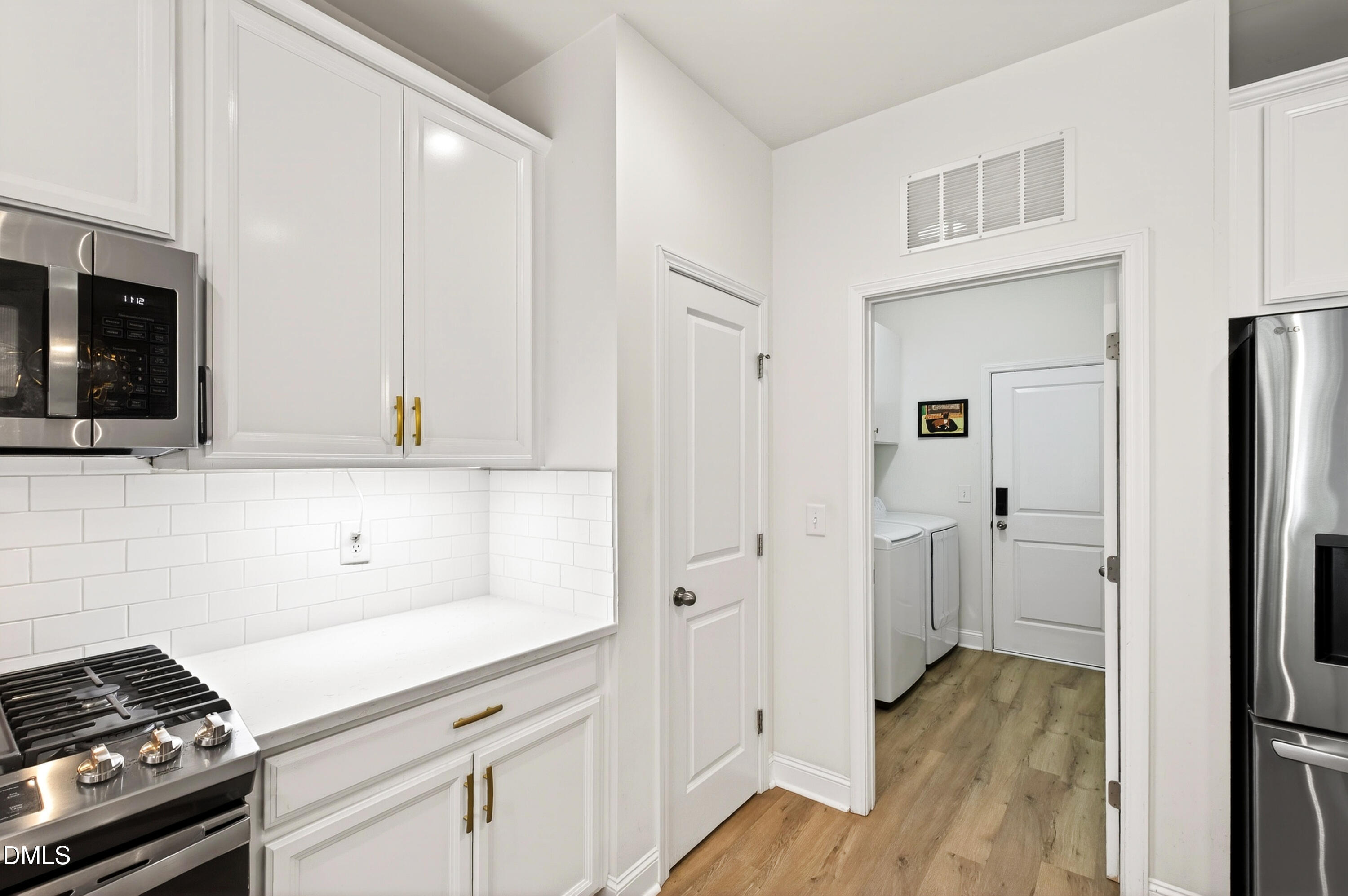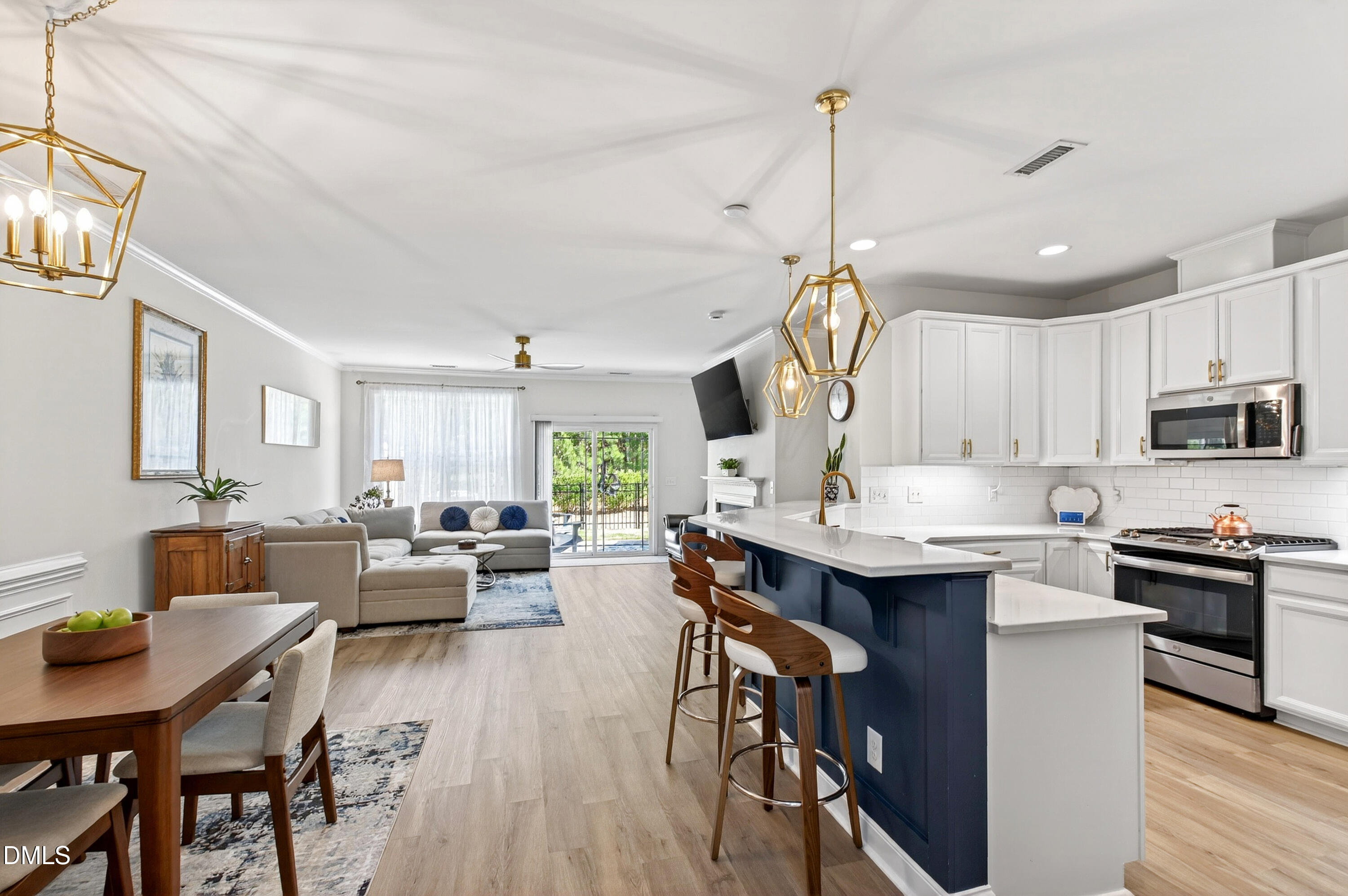 A two story foyer leads into a bright, open concept main area. The kitchen features quartz countertops, a five burner gas range, a stylish backsplash, and updated lighting, creating a well designed and functional space for everyday living. Luxury vinyl plank flooring runs throughout the main level, offering durability and a cohesive look.