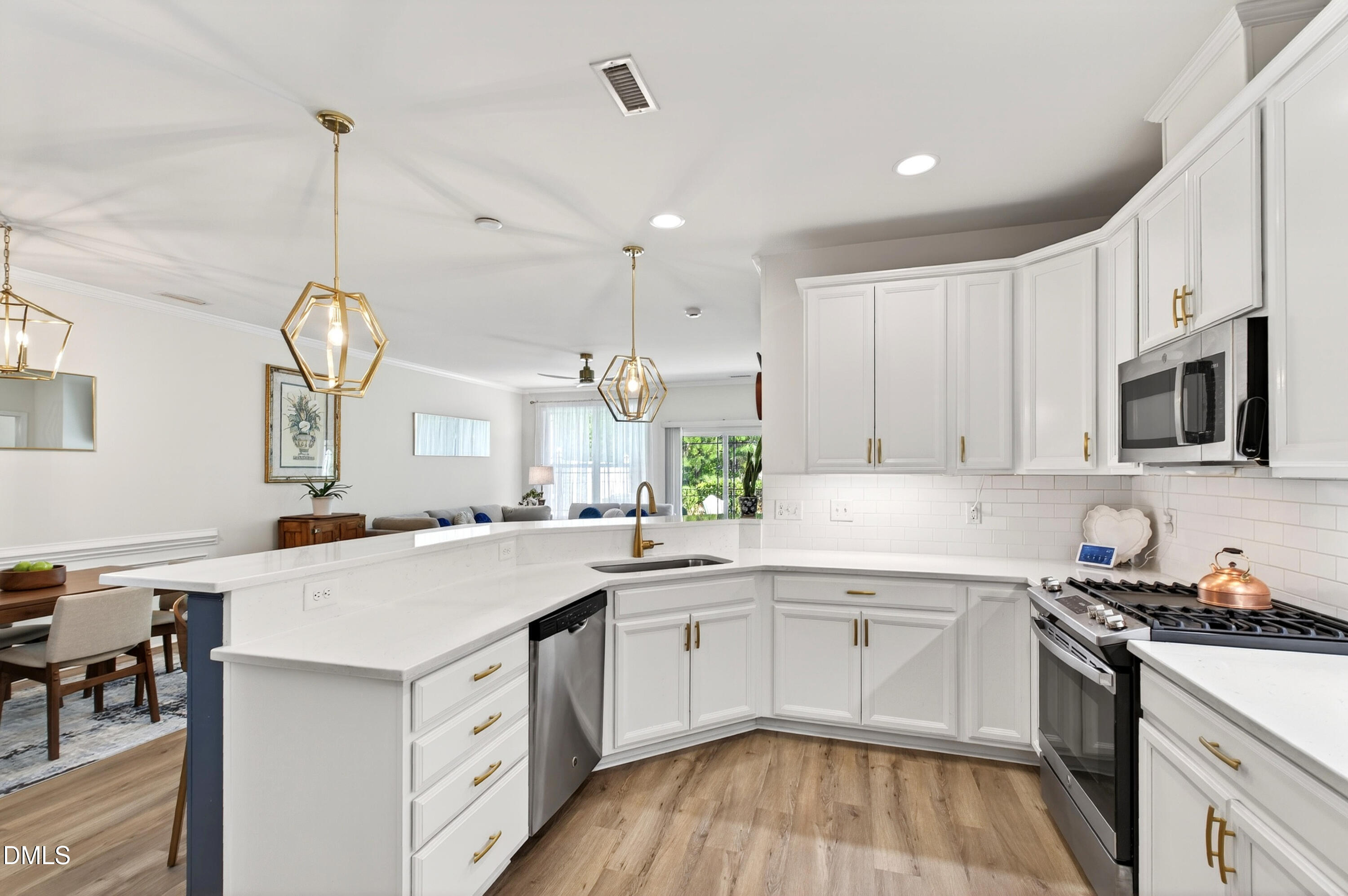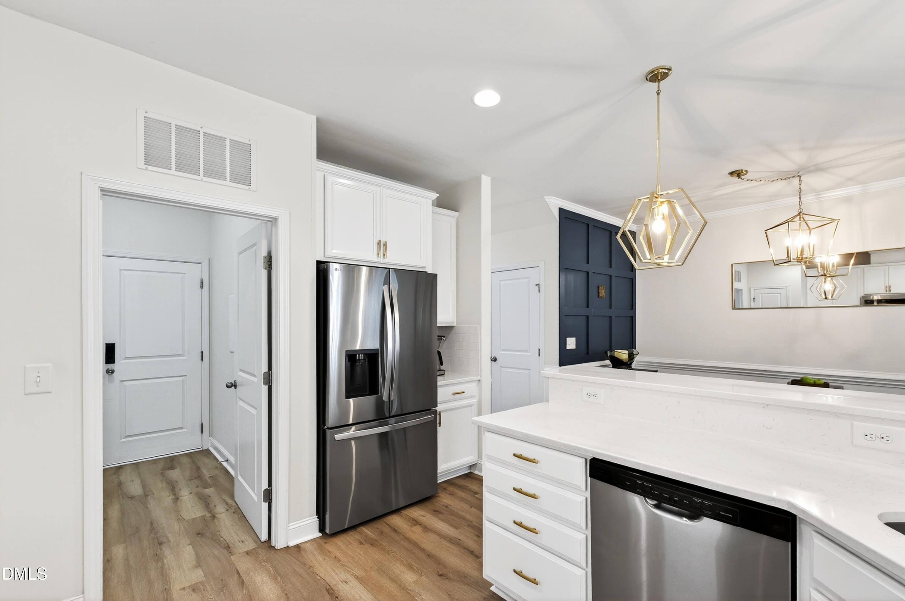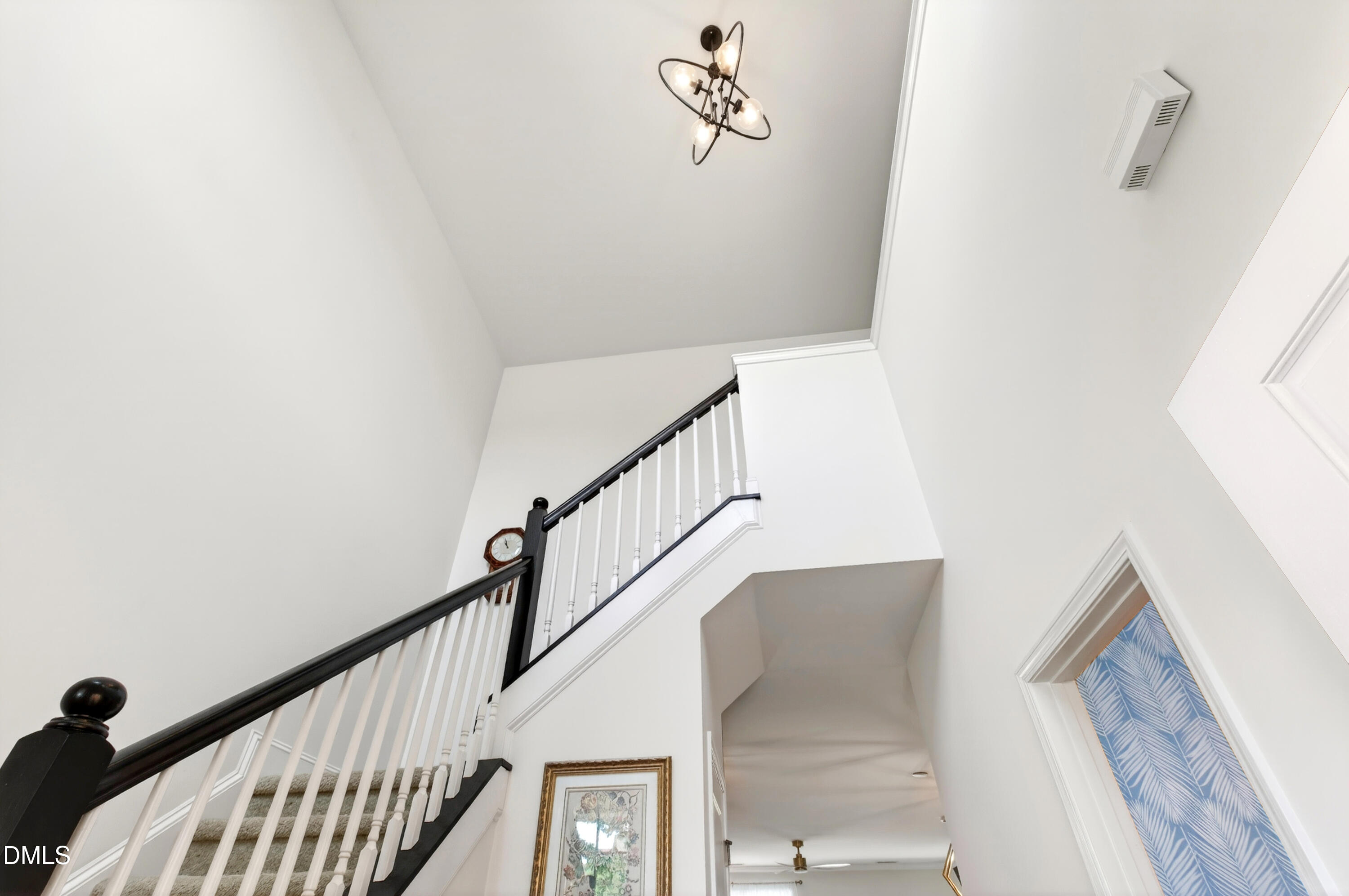 A two story foyer leads into a bright, open concept main area. The kitchen features quartz countertops, a five burner gas range, a stylish backsplash, and updated lighting, creating a well designed and functional space for everyday living. Luxury vinyl plank flooring runs throughout the main level, offering durability and a cohesive look.