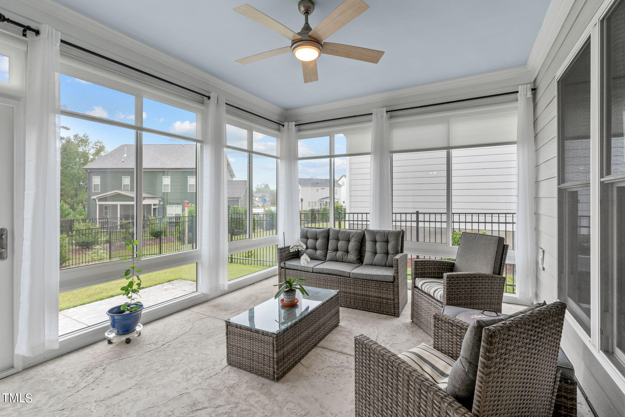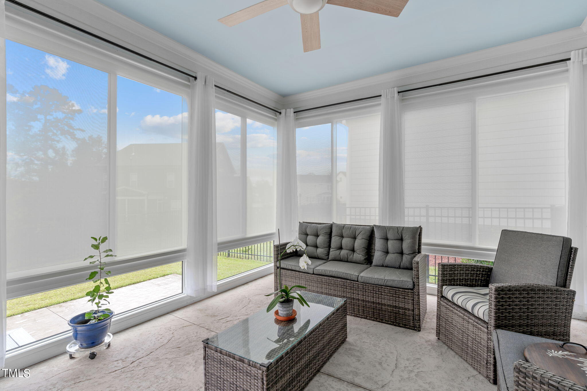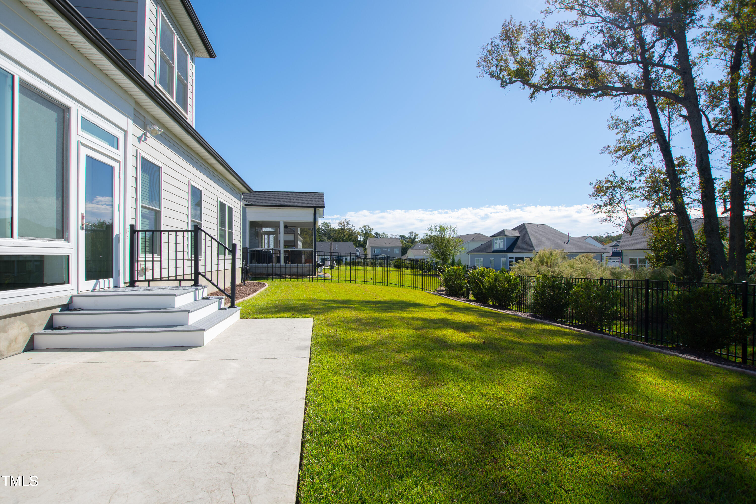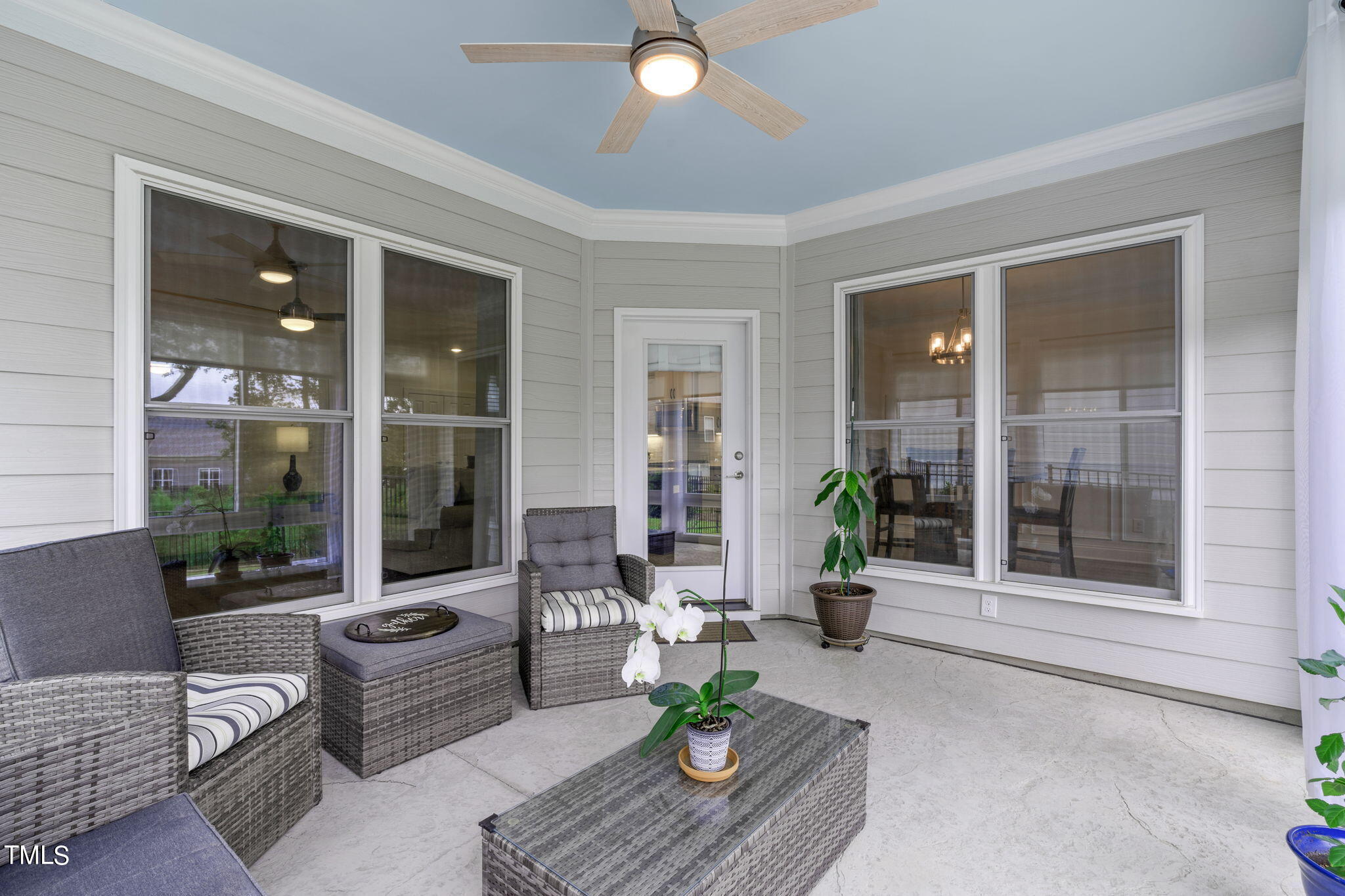 Begin your outdoor experience on the east-facing covered porch with a charming haint blue ceiling. The outdoor living spaces continue with a high-quality Southern Exposure three-season room, upgraded with double-pane, insulated horizontal sliding glass windows. The landscaping has been refreshed with Ashlyn Chisel Edge edging, and Trex(tm) steps lead to a beautifully landscaped yard with an aluminum fence and natural green space, offering both beauty and tranquility.