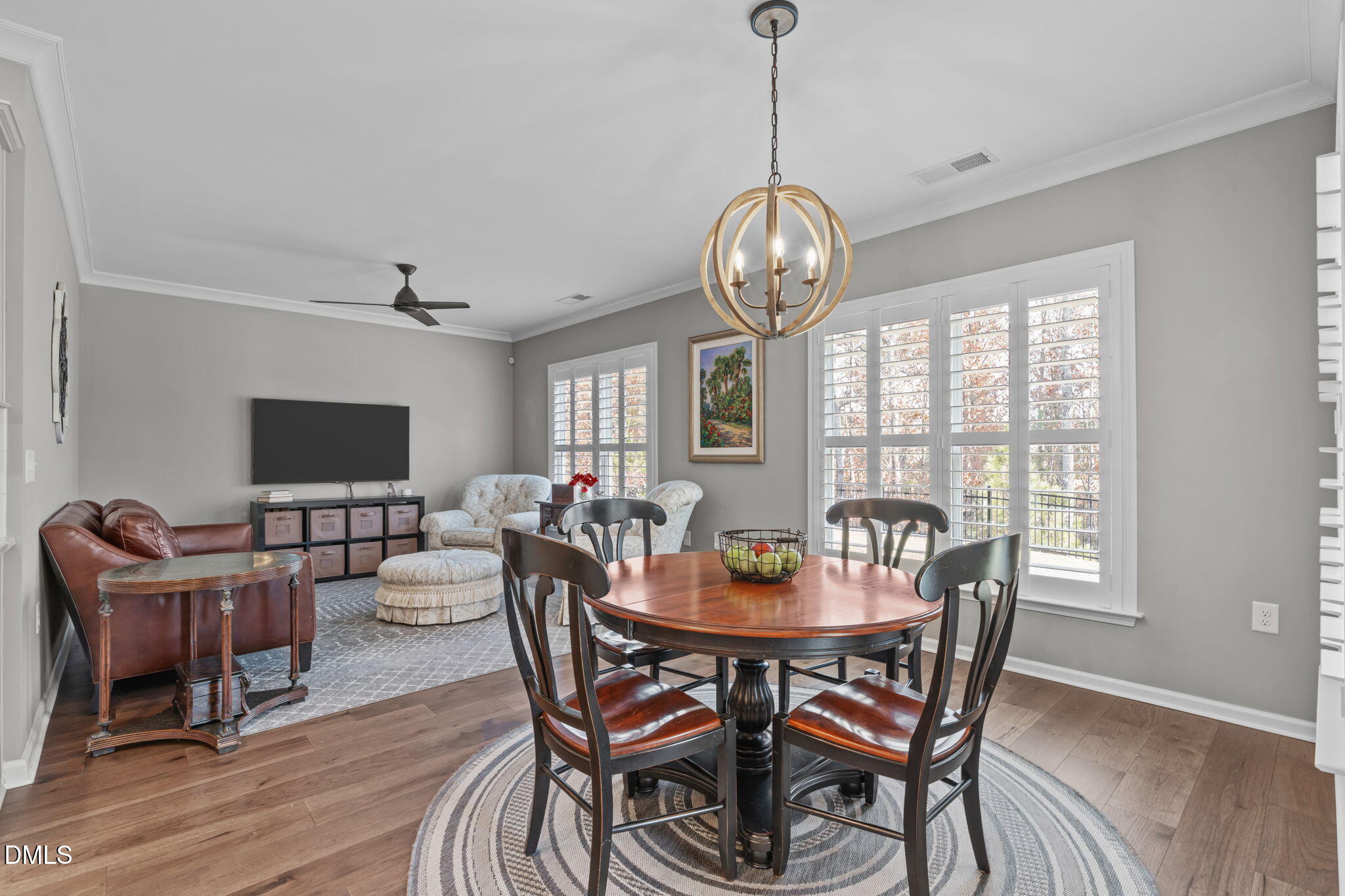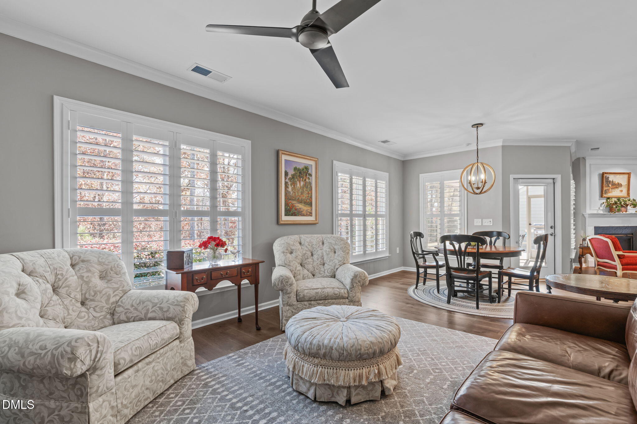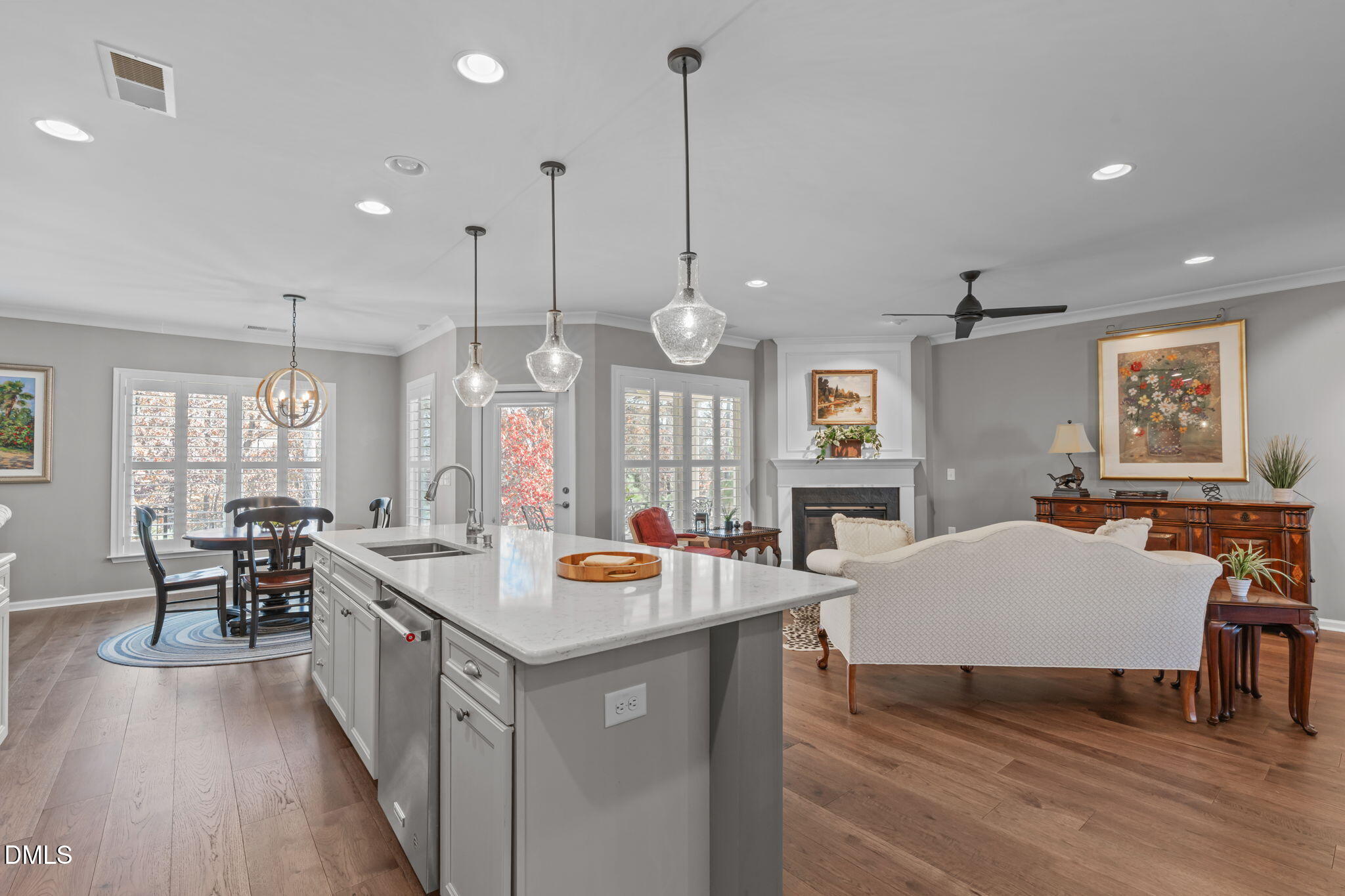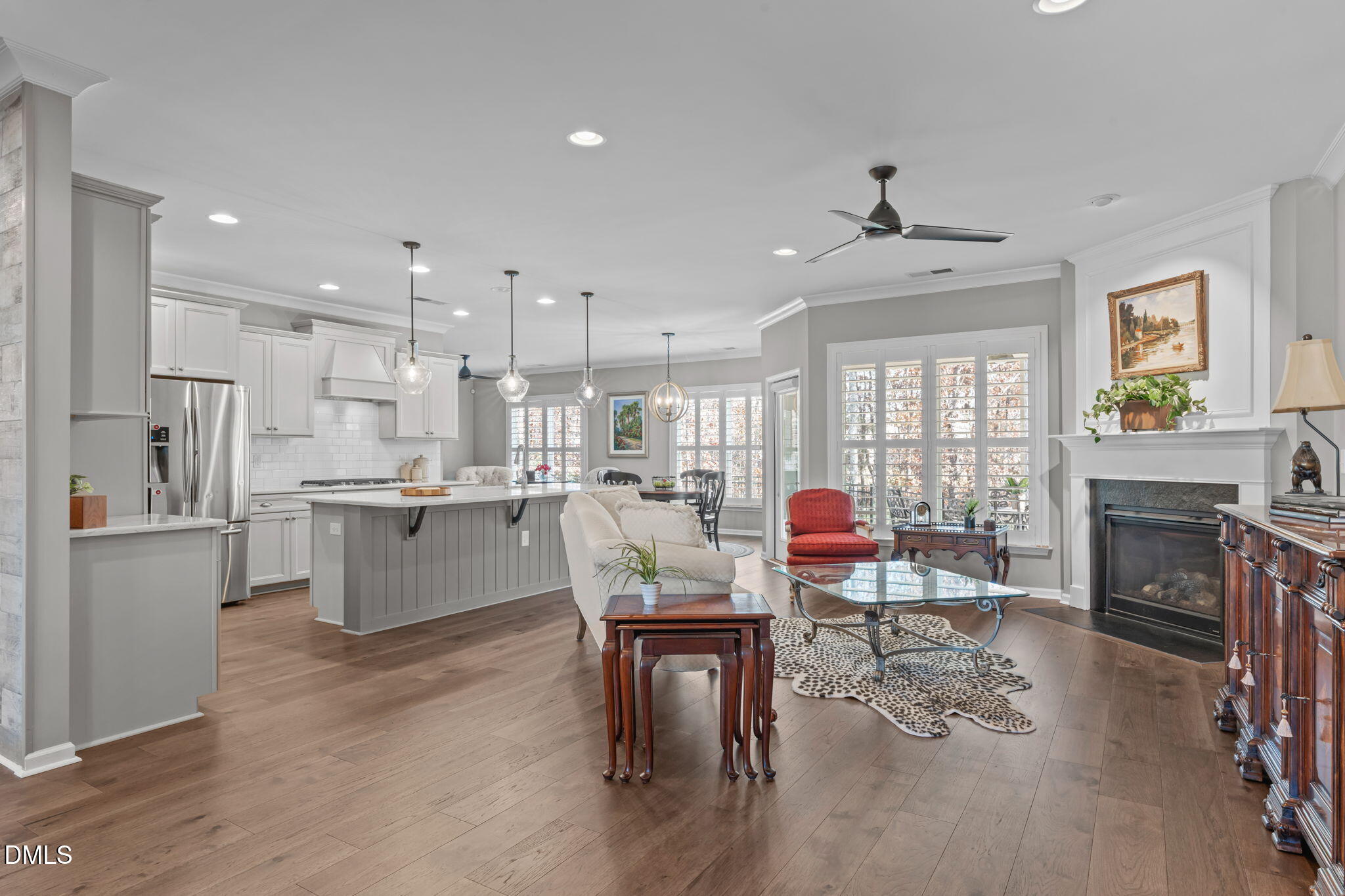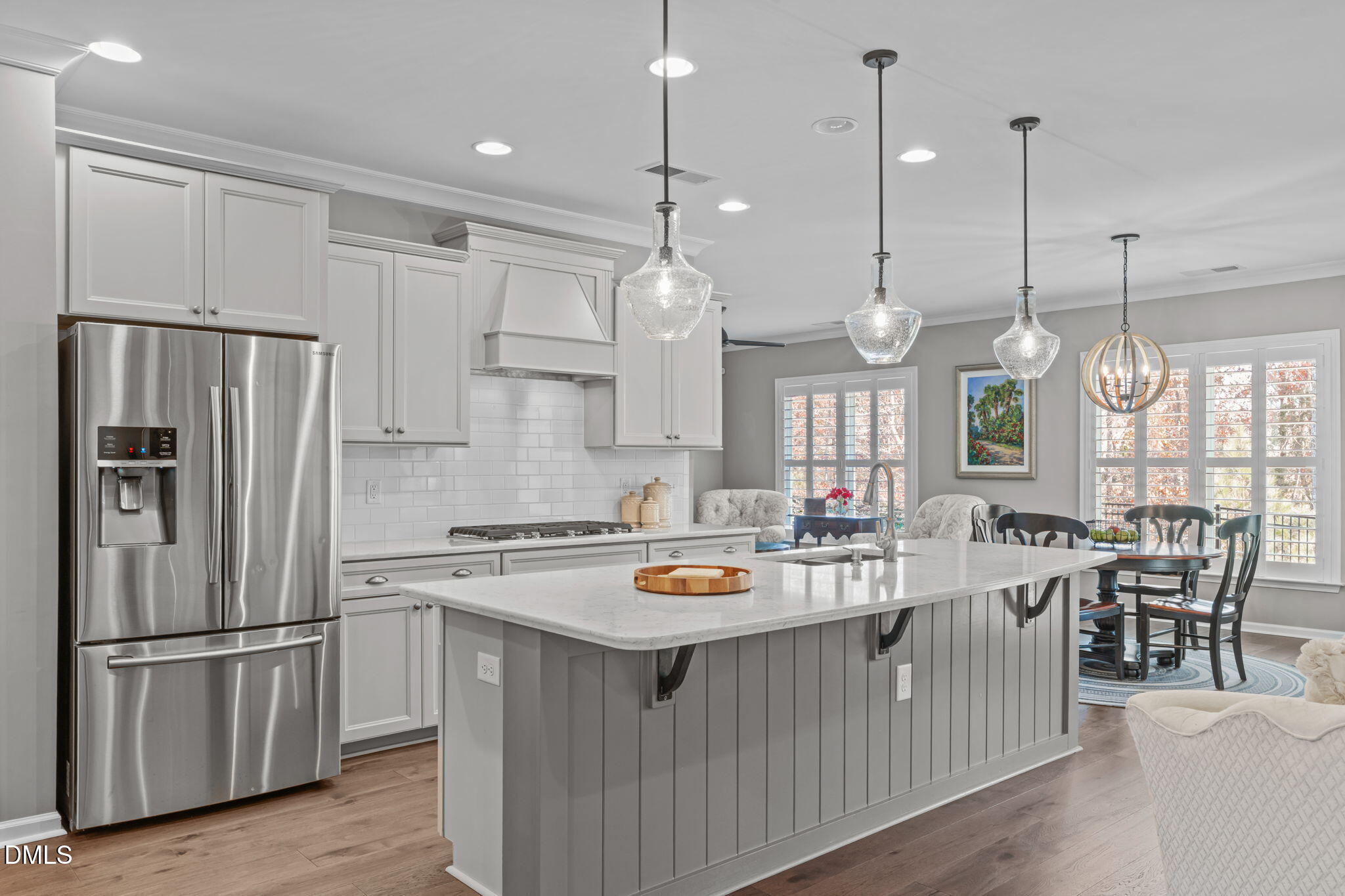 The main level includes three bedrooms including the primary suite, with a fourth bedroom or bonus room upstairs along with conditioned walk-in storage. The floor plan lives beautifully with an open concept layout that includes a dining room, kitchen with eat-in space, and a keeping or sitting area. The large island allows for effortless entertaining and everyday comfort. Plantation shutters and custom pull-down blinds enhance the interior.