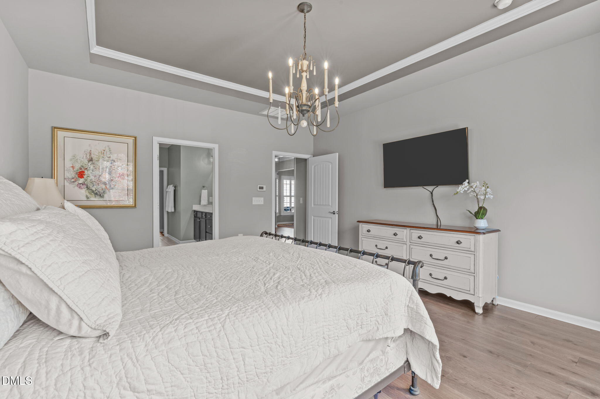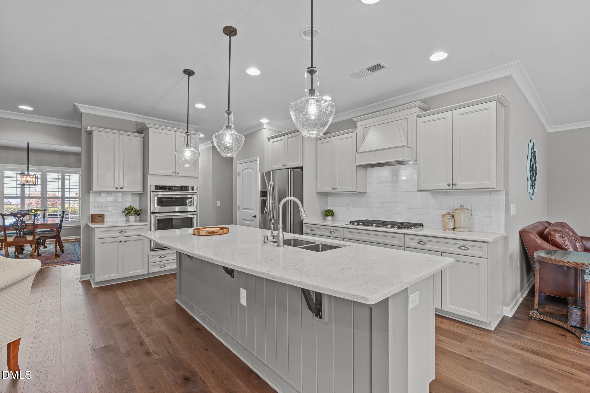The primary suite features dual vanities, a soaking tub, a separate tiled shower, a spacious water closet, and an oversized walk-in closet with built-in shelving. The gourmet kitchen is designed for both style and functionality with upgraded built-in stainless steel appliances, a gas range with hood, quartz countertops, large island with pendant lighting, and convenient pull-out drawers. New flooring extends throughout the main level with tile in all wet areas.
